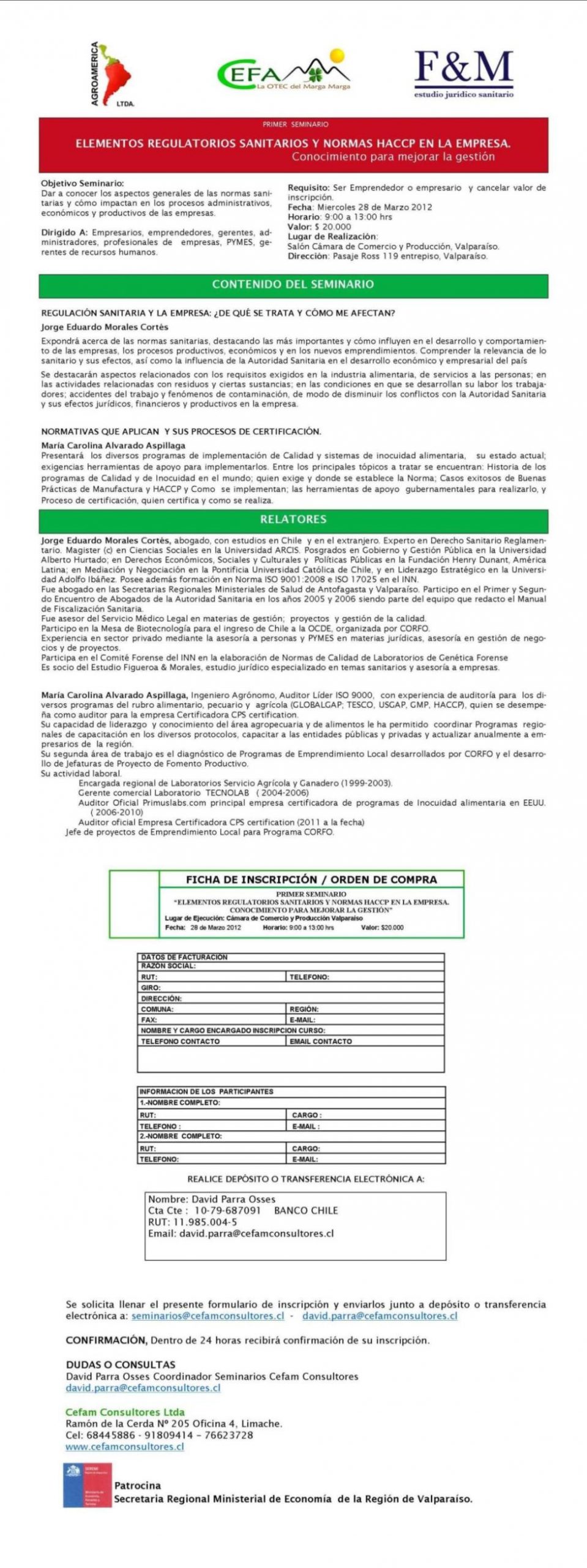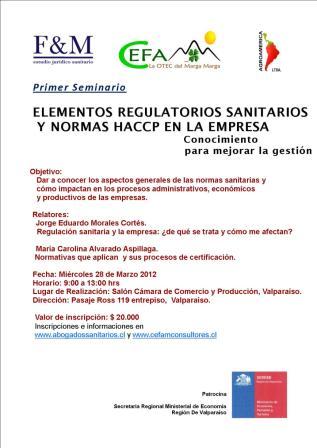 Estudio Jurídico Figueroa & Morales, Abogados Sanitarios, en conjunto con CEFAM, han organizado para este miércoles 28 de Marzo 2012, en el Salón Cámara de Comercio y Producción, ubicado Pasaje Ross 119 entrepiso, Valparaíso, a las 09:00 horas el Primer Seminario sobre ELEMENTOS REGULATORIOS SANITARIOS Y NORMAS HACCP EN LA EMPRESA, Conocimiento para mejorar la gestión”